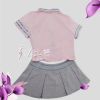 **款式介绍:超短及胸设计,性感迷人,上衣采粉红色面料,银色条领,搭配精巧灰色小领带更显清纯气息;与银色衣领边相呼应的