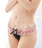 **款式介绍:前面采用轻柔的黑色印花透纱面料设计,腰间点缀黑色蝴蝶结,后片露臀松紧边缘恰到好处的宽边蕾丝缠绕,臀部全裸
