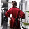 **款式介绍:真丝面料家居服套装,舒适轻柔,红色外套搭配黑色的蕾丝边,神秘性感,女性的**爱。里面黑色网纱裙装,超低胸V
