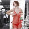 本产品包含:性感裙装+内裤。款式介绍:红色短裙极富女人味的设计细致入微。纤细的吊颈系带,连接低胸花边,整体掐腰设计,凸现**的身体曲线。转个身,立即摇身成为深夜**娇艳的花朵! 尺寸介绍:胸围:74-84CM 产品质地:锦纶90% 氨纶10% 洗涤提示: 30度水温手洗,不可漂洗,悬挂凉干,禁止漂白。"