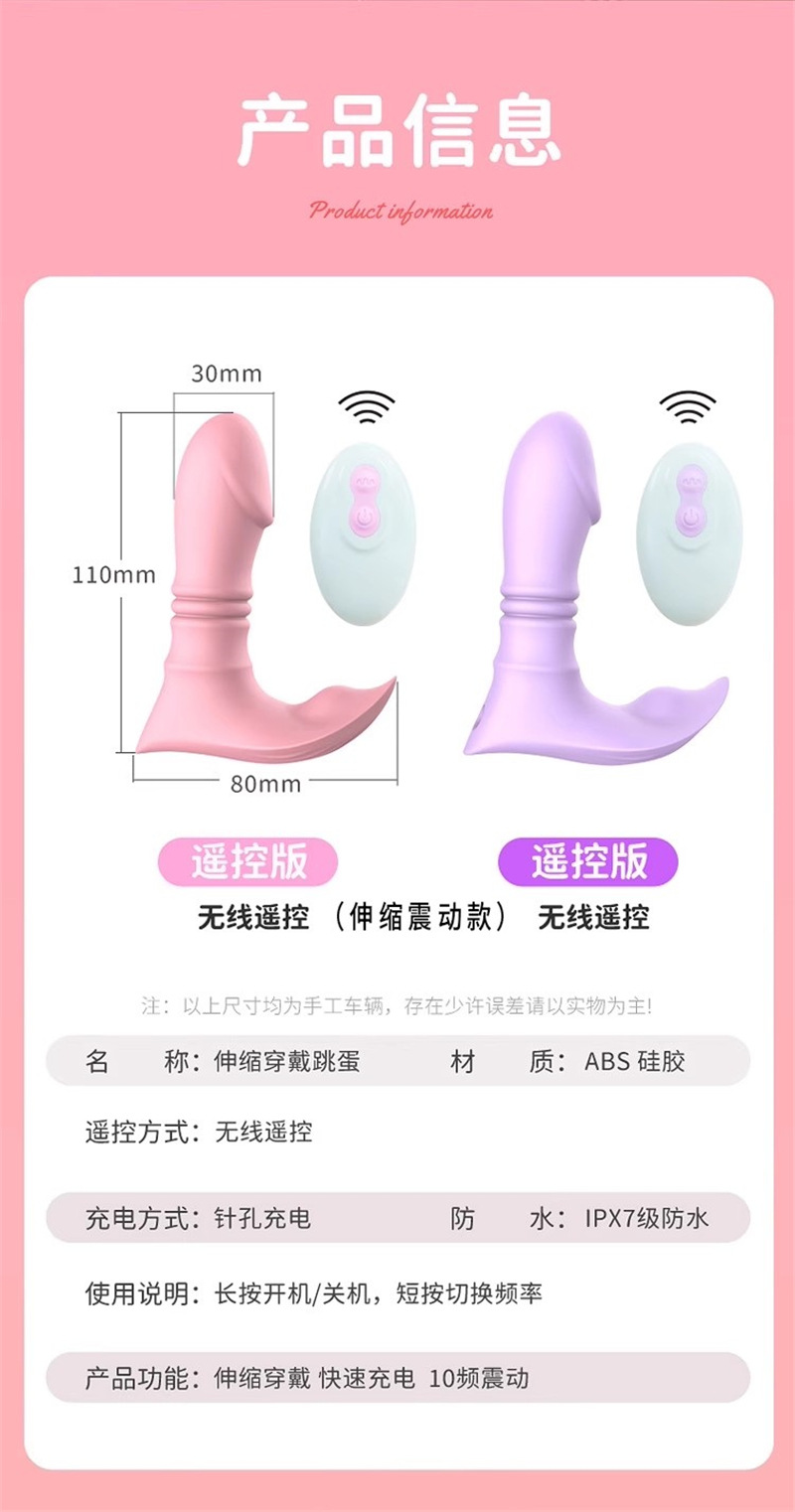 产品介绍: 无线遥控女用震动伸缩穿戴跳蛋自慰器穿戴震动器具夫妻情趣情趣用品。