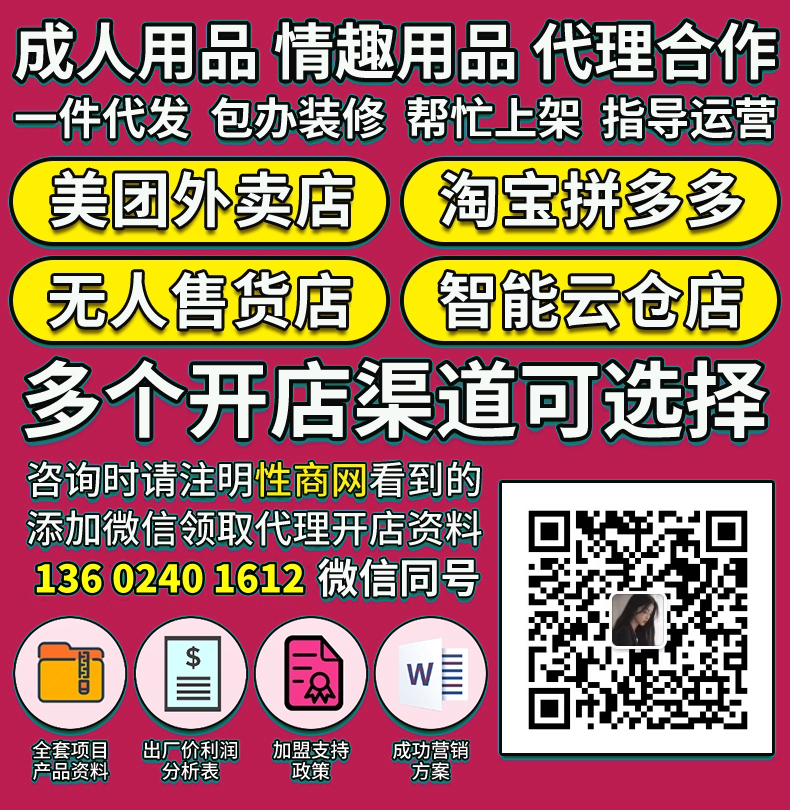 ,一人开N店:微商、淘宝、拼多多、京东、天猫、阿里巴巴、有赞、无人售货店、美团外卖、饿了么、线上线下都可做,将消费者一网打尽。帮开店、装修、上架、还有运营专员一对一指导,终身服务。提供成人用品各大品牌一手货源,厂家直供一件发货。单品一般有200%-500%以上的利润。提供营业执照、二类医疗办理指导。授予代理商开网店、实体店资质证件。咨询微信:13602401612