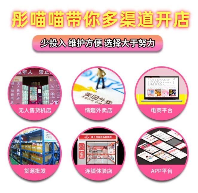 【彤喵喵】情趣成人用品开店,诚邀情趣用品及成人用品代理商加盟,提供多样化的丰富货源选择,支持一人开N店:小程序、淘宝、拼多多、京东、24小时无人售货店、自动售货机、美团饿了么外卖、云仓自助超市、实体娃娃馆线上线下都可做,将消费者一网打尽。