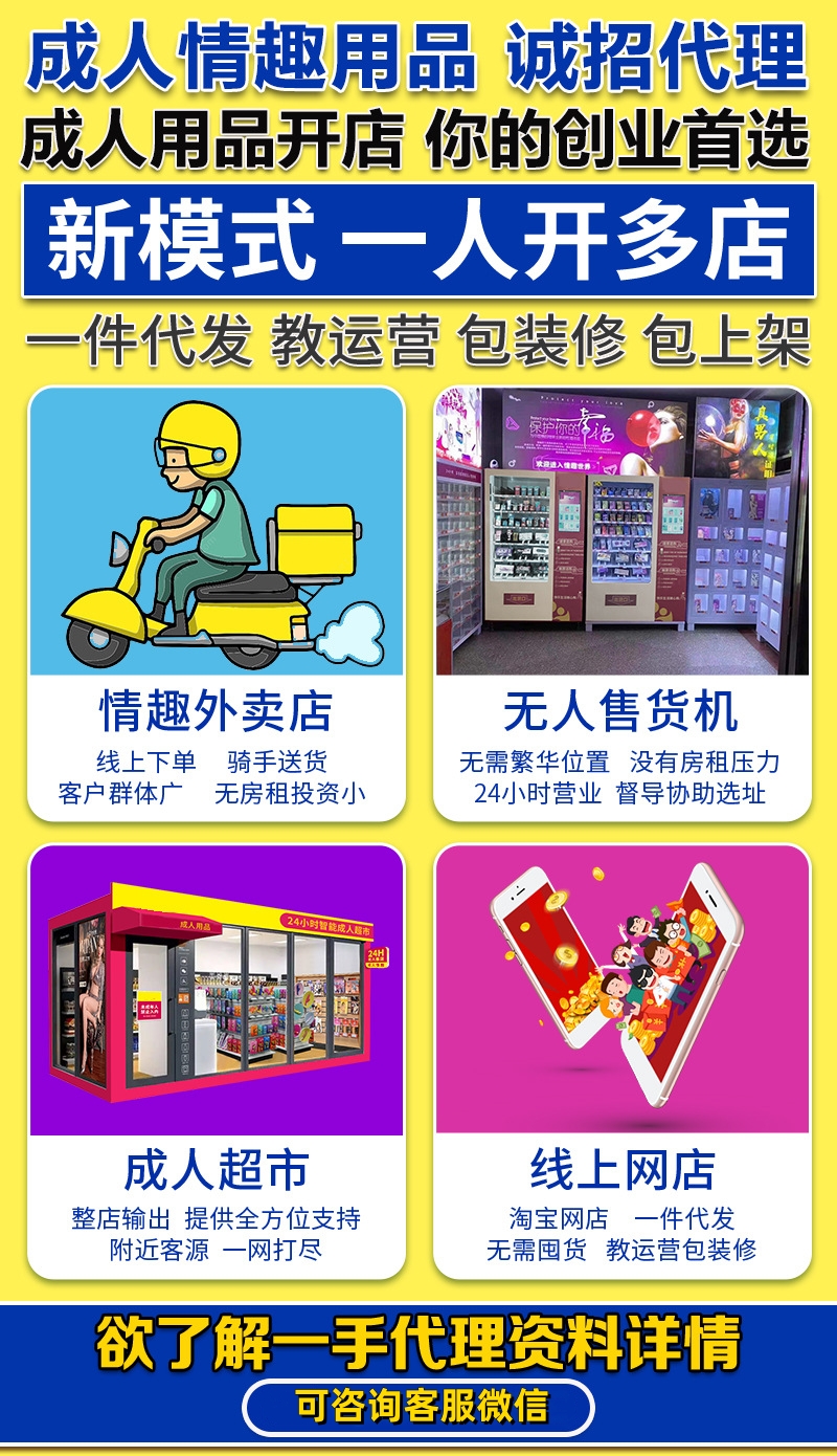 低成本创业攻略:千元开成人用品网店,工作副业两开花!上班族,宝妈,大学生都可以做的副业,一部手机,开成人用品线上网店,外卖店,一人可以在多个平台上开店。边上班边赚钱,全天进账,隐私性强,一件代发无需囤货发货,亲朋好友不会知道。成人用品开店有多种套餐可选:无人售货机店、无人仓、美团外卖、饿了么、淘宝、拼多多、京东、天猫、阿里巴巴、微信小程序、独立商城等。单品一般有200%-500%的利润。提供营业执照、二类医疗办理指导。授予代理商开网店、实体店资质证件,省去很多麻烦。咨询微信:1046141857