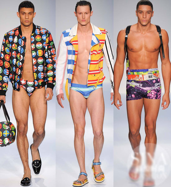 jeremy scott加入了MOSCHINO之后,不仅为女装带来了鲜活的魅力,对于男装的改造也是大刀阔斧。表情图案和条纹印花映衬在内衣中,将一身的“好肉”反射出了幽默性感。