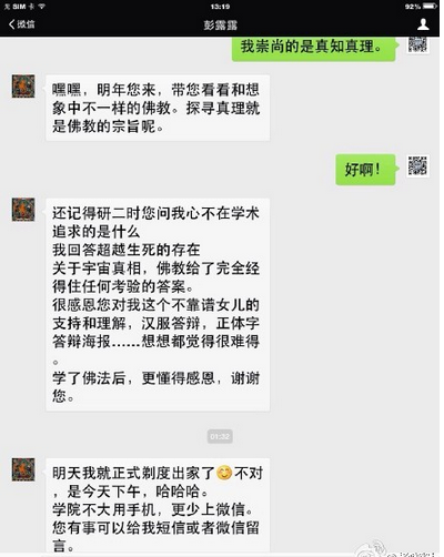 19日凌晨,当彭露露将她出家的决定告诉彭晓辉时,彭晓辉一时有些错愕。但很快表示支持,学生有她自己的想法和追求。“她说她在追求学问,真理,终极真理。”不过,在谈起“学术女儿”的选择时,57岁的彭晓辉还是哽咽失声,“她说哲学是各个学科的统领,而佛学是哲学中的哲学。”