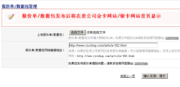 按提示上传报价单、数据包文件或填写链接地址,点击提交按钮即上传完成,如下图: