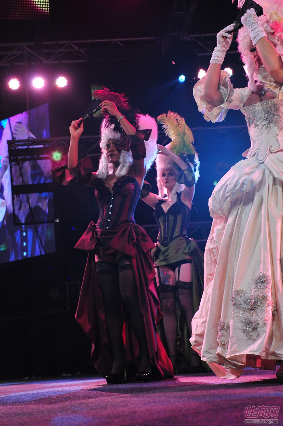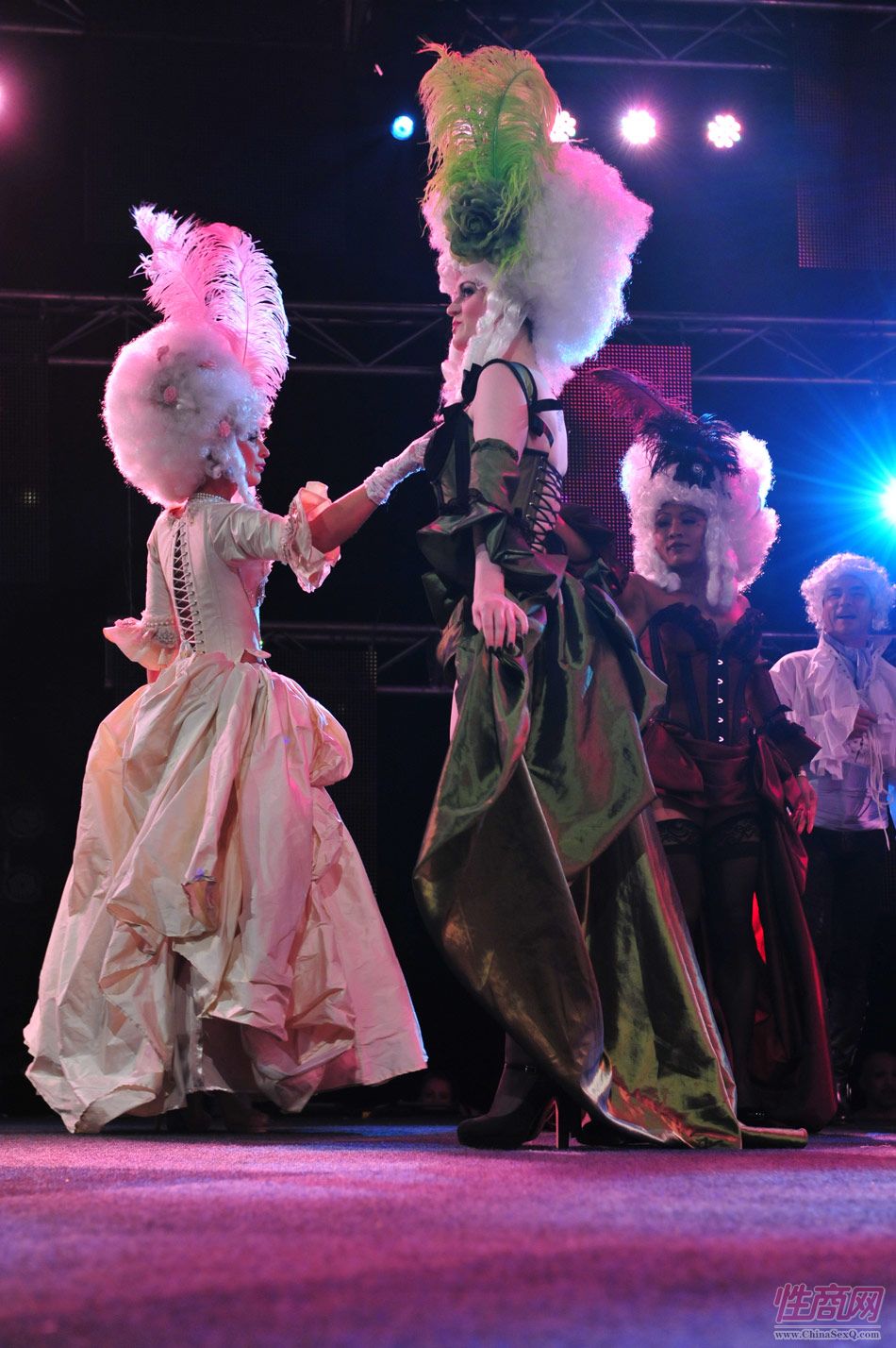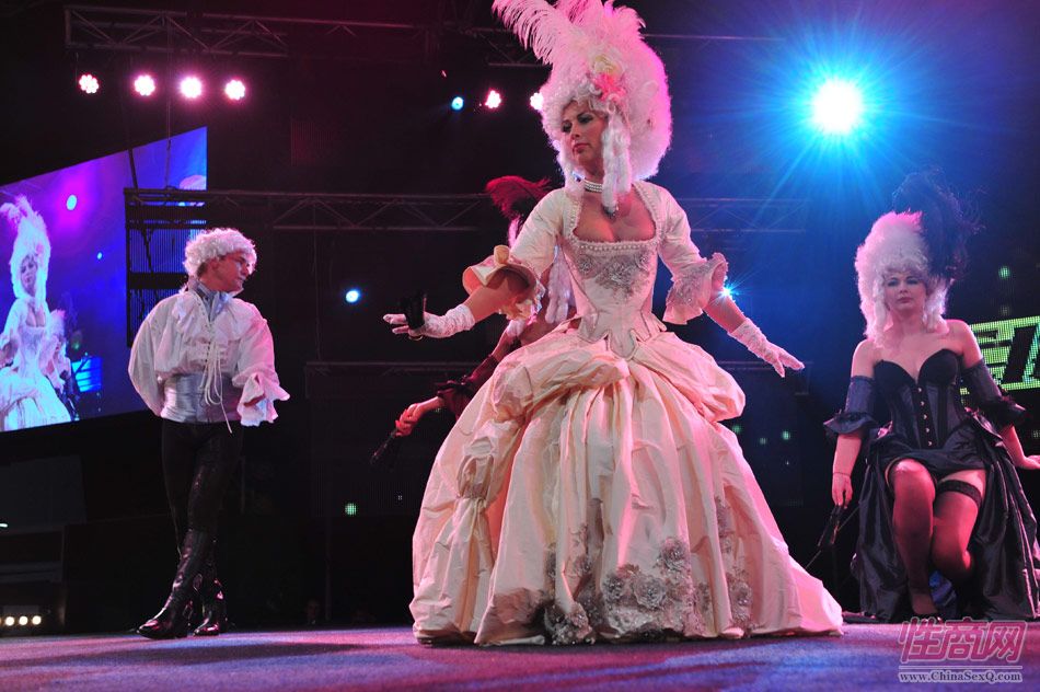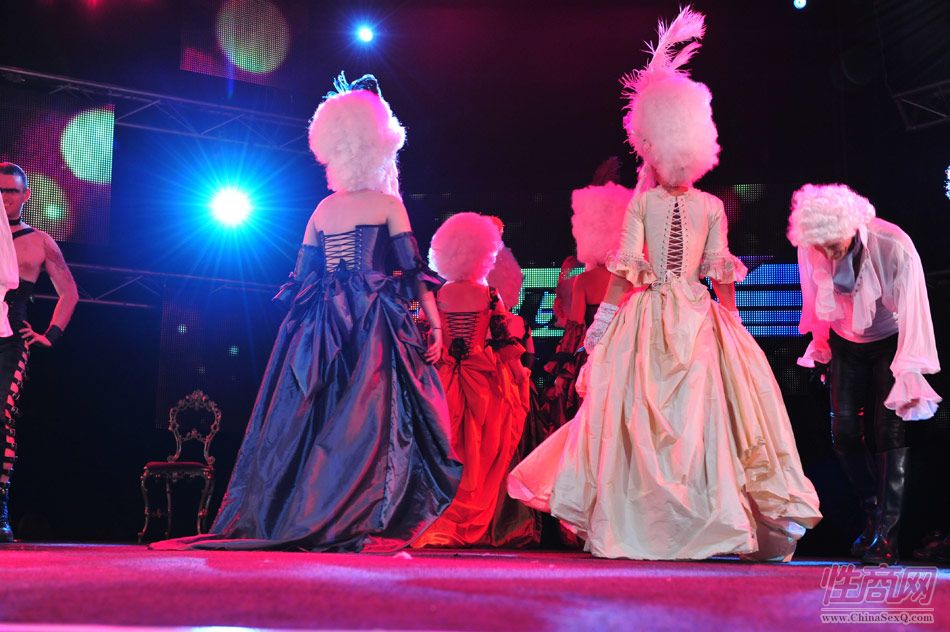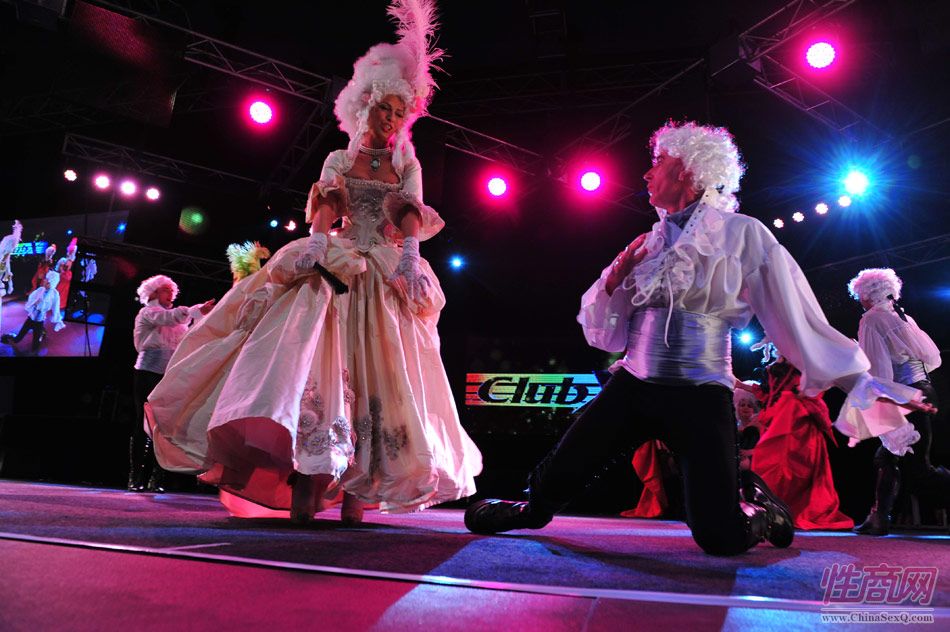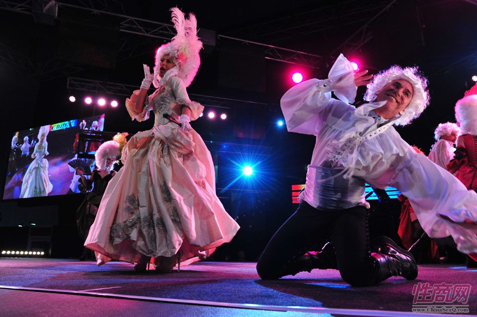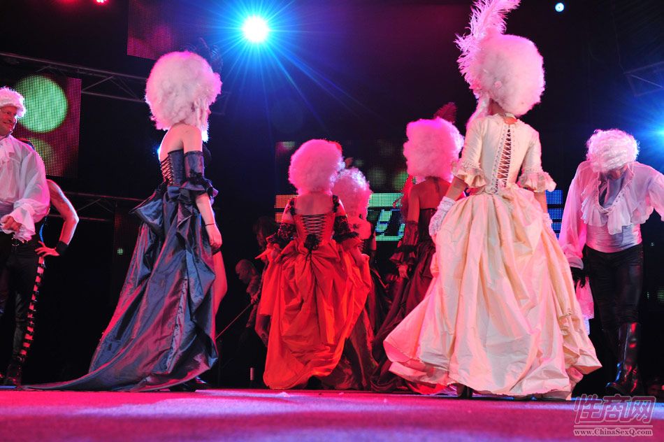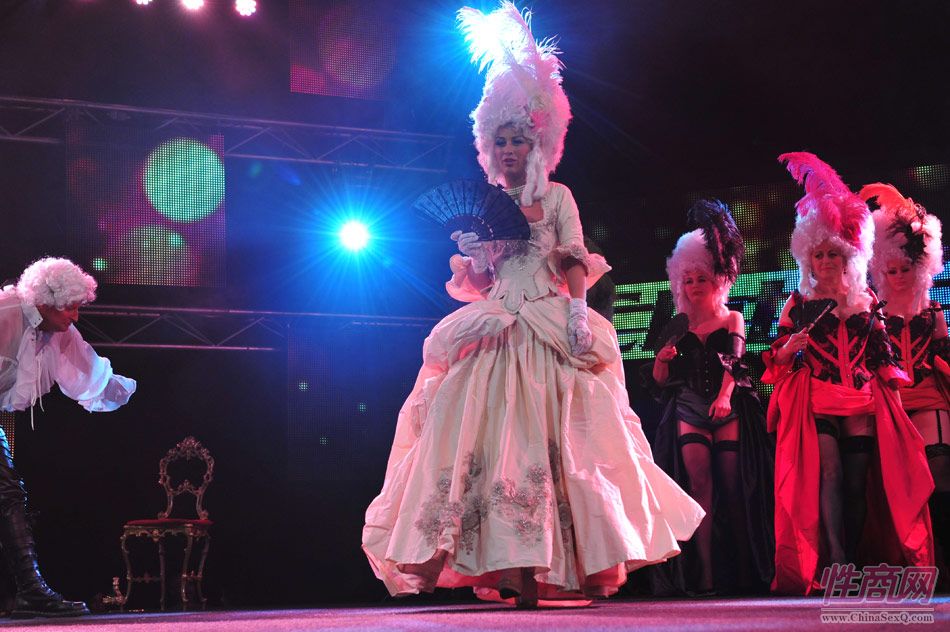 2013澳大利亚墨尔本成人展上演古欧洲贵族情趣服饰秀。贵妇服装色彩艳丽,头饰上插有长长的白色或红色羽毛,绅士戴着银白色假发(现代欧洲律师仍然沿用),现场观众恍如隔世,穿越回古欧洲,领略宫廷贵族们的风采。以下是现场图片第一部分