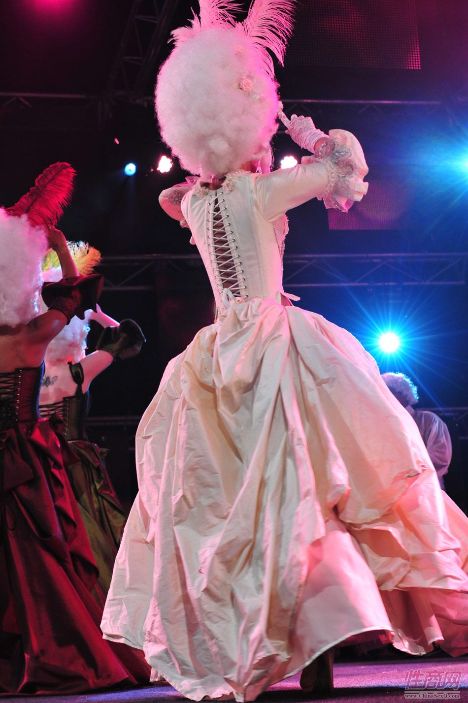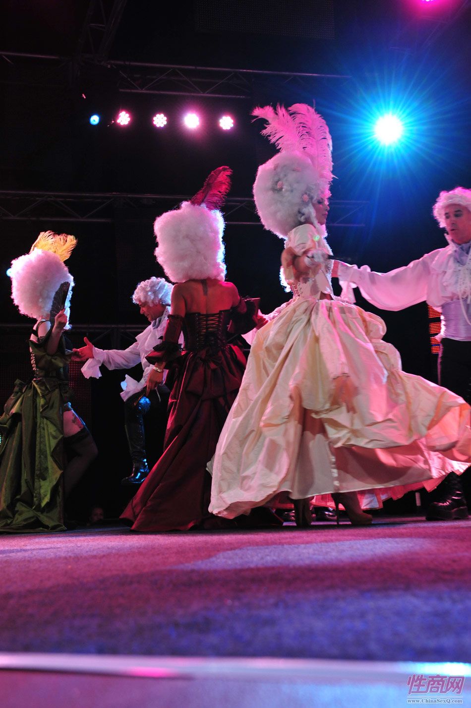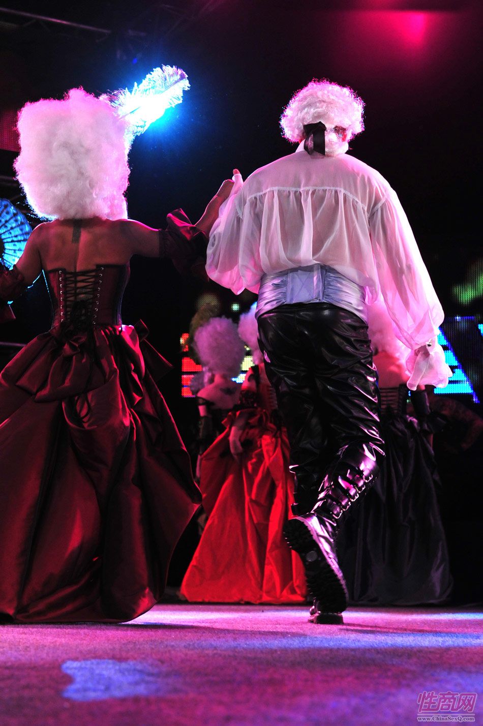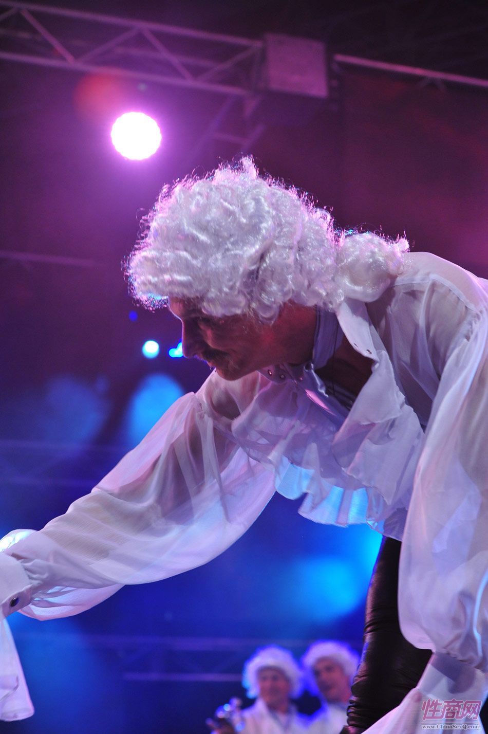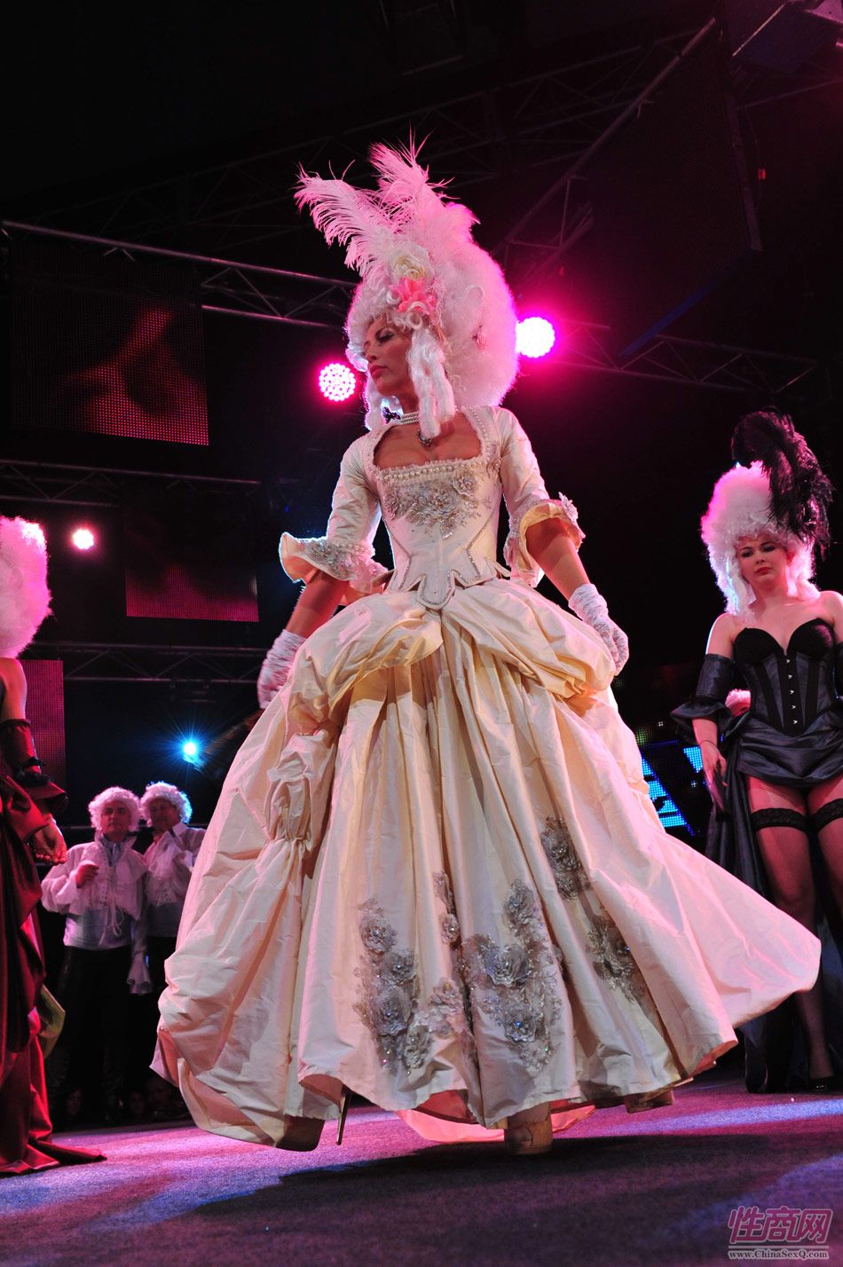 2013澳大利亚墨尔本成人展上演古欧洲贵族情趣服饰秀。贵妇服装色彩艳丽,头饰上插有长长的白色或红色羽毛,绅士戴着银白色假发(现代欧洲律师仍然沿用),现场观众恍如隔世,穿越回古欧洲,领略宫廷贵族们的风采。以下是现场图片第一部分