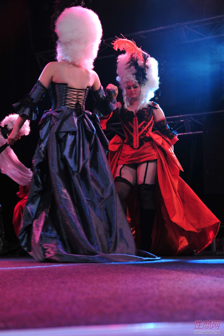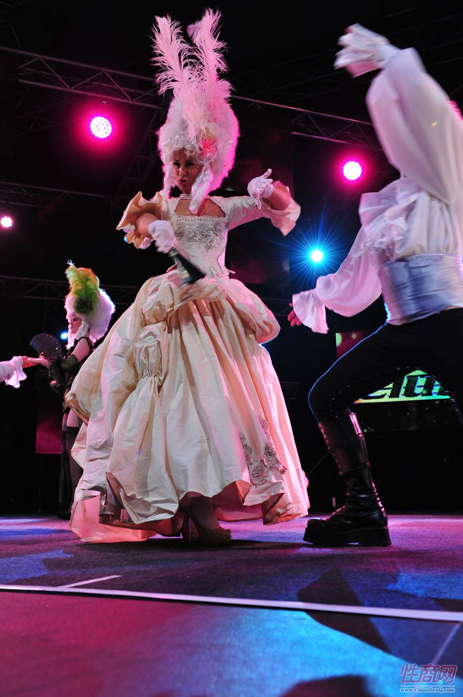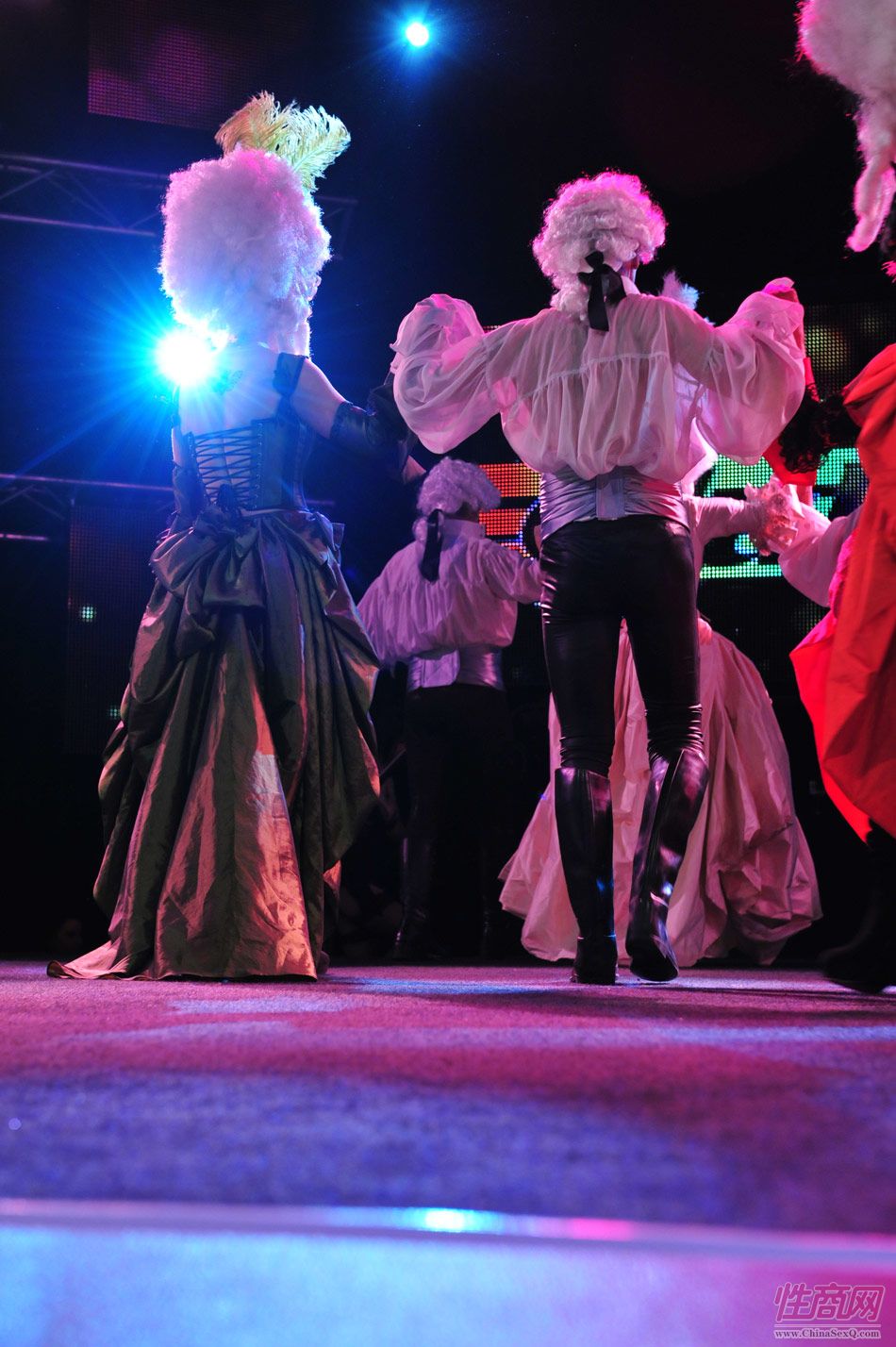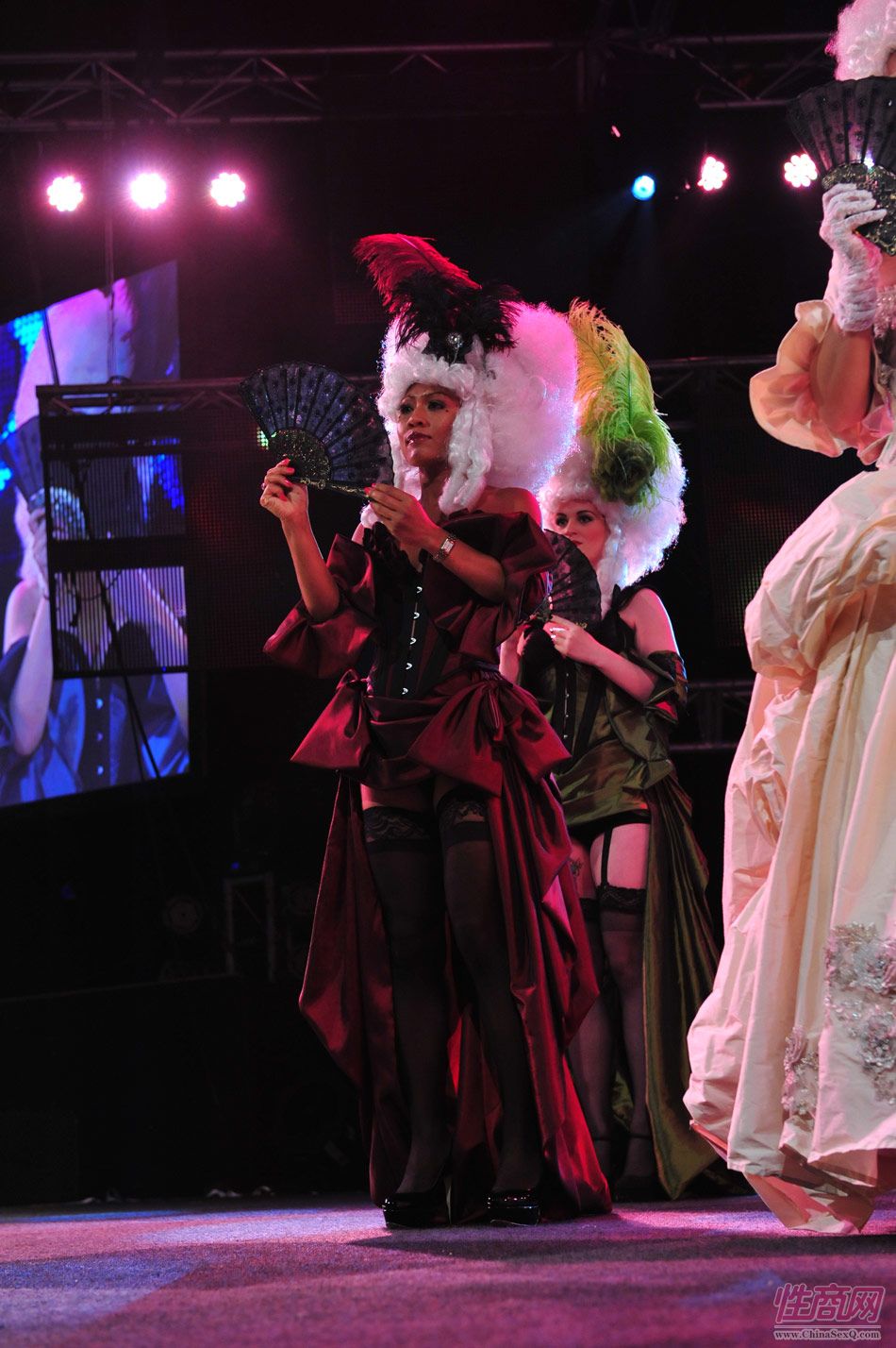 2013澳大利亚墨尔本成人展上演古欧洲贵族情趣服饰秀。贵妇服装色彩艳丽,头饰上插有长长的白色或红色羽毛,绅士戴着银白色假发(现代欧洲律师仍然沿用),现场观众恍如隔世,穿越回古欧洲,领略宫廷贵族们的风采。以下是现场图片第一部分