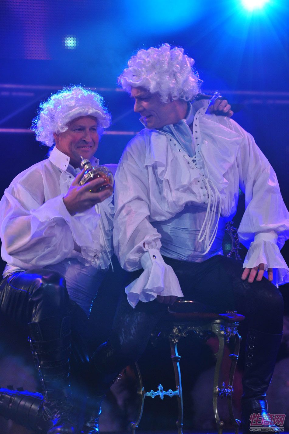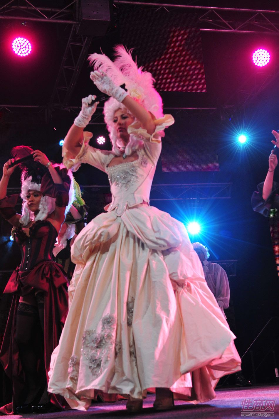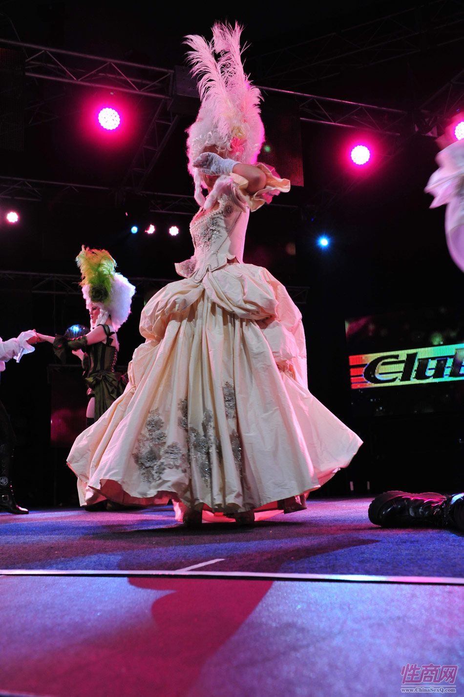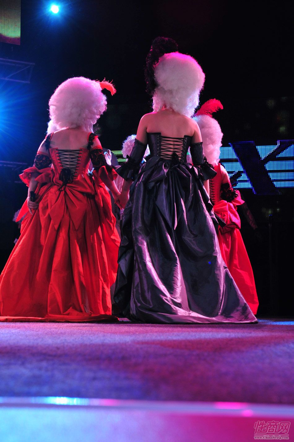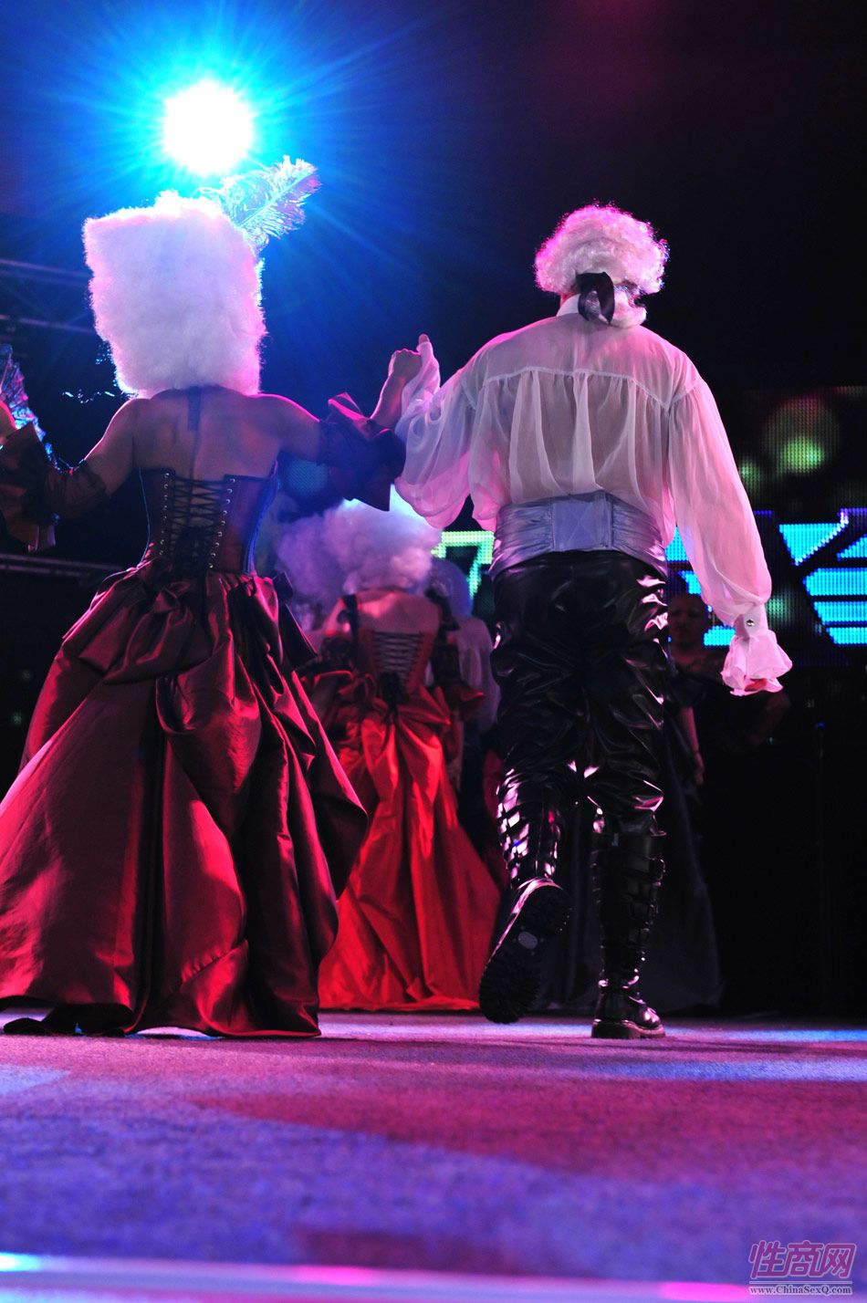 2013澳大利亚墨尔本成人展上演古欧洲贵族情趣服饰秀。贵妇服装色彩艳丽,头饰上插有长长的白色或红色羽毛,绅士戴着银白色假发(现代欧洲律师仍然沿用),现场观众恍如隔世,穿越回古欧洲,领略宫廷贵族们的风采。以下是现场图片第一部分