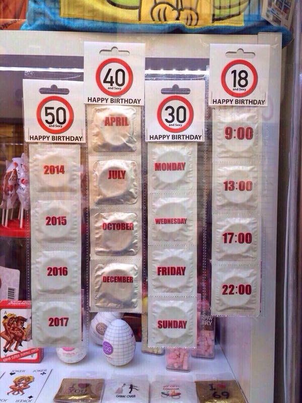 虽然每排安全套都是4入,但看到使用的方式可就有极大差异。18岁的那排写着9点、13点、17点和22点;30岁那排则是写着周一、周三、周五和周日;40岁那排则是以月份计算,4 月、 7月、10月和12月;50岁的则是被依年份计算,4 入的保险套可以用4年。
