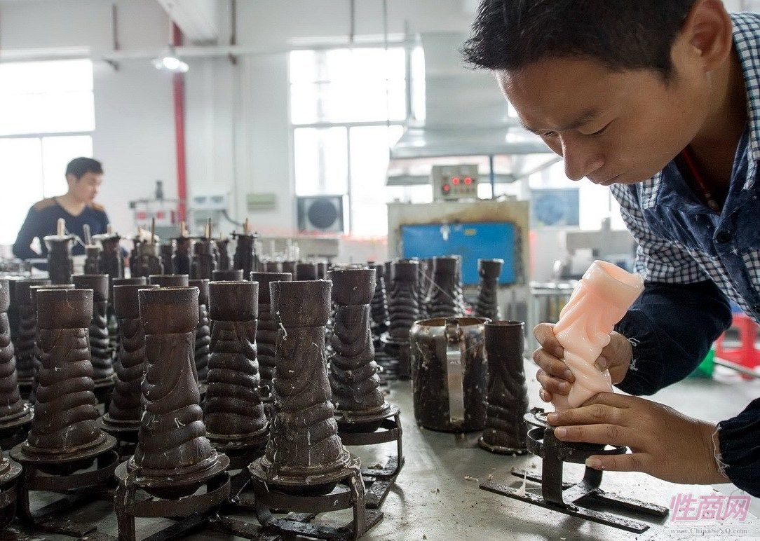 情趣用品生产车间,工人正在对刚成型的硅胶产品进行修整。