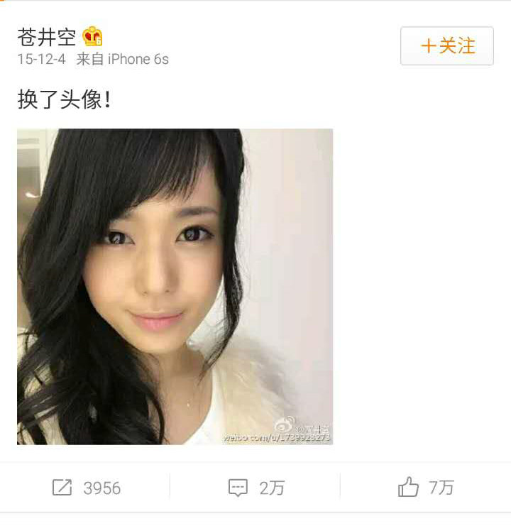苍井空的微博的粉丝量已经达到了1640万,一个让政治家都眼馋的数字。像换个头像这么简单的日常,评论数都达到了2万、点赞的7万,超过了别人裸奔的热度。啥都不说了,广大宅男们,瞅瞅自己多出息。