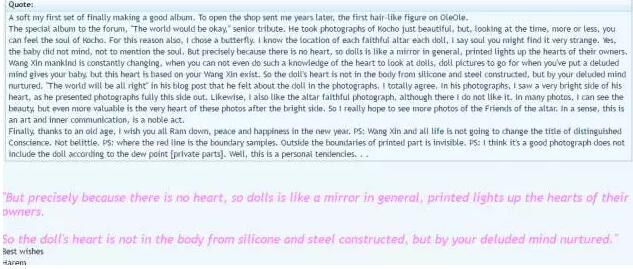 一位来自法国南部的EX品牌人偶玩家在论坛里发了一个帖子,题目为:Chinesecreativitywiththedollasart(中国的人偶创意就是门艺术)