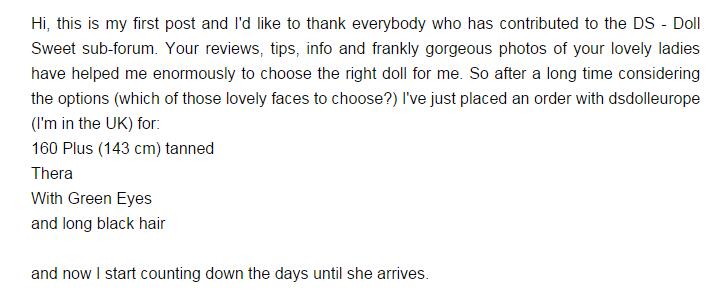 -大家好,这是我的第一个帖子,非常感谢大家在DSDOLL(现EXDOLL)论坛里的贡献。你们的建议,信息,以及那些美丽的照片帮助了我最终选择了一个适合的娃娃。经过一段时间的考虑之后,我选择了一款欧版的人偶,她叫Thera,有一双绿色的眼睛,黑色长发。我现在正等着她的到来呢~