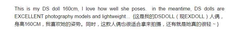 -大概意思就是这位仁兄买了EX品牌人偶已经半年了,他认为人偶真的是太棒了,物超所值。在这之前,他已经花费多年时间来寻找一个完美的人偶,但是都没有找到合适的。直到他看到EX品牌的仿真人偶后,他认为产品价格合理,很漂亮,也很轻巧。对于他购买的EX品牌人偶他给出了一段经典评论: