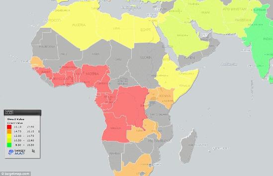 这张地图显示了世界上不同国家的男人勃起后的尺寸分布,大小依次为:红色>橙色>黄色>浅灰色>绿色。涂红色的国家最大,绿色的最小。