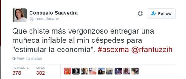 部长大人的这一举动也让民众炸开了锅,许多网友认为此举“不合适”,女记者Saavedra则表示:“拿着充气娃娃来刺激经济,是多么羞耻。”