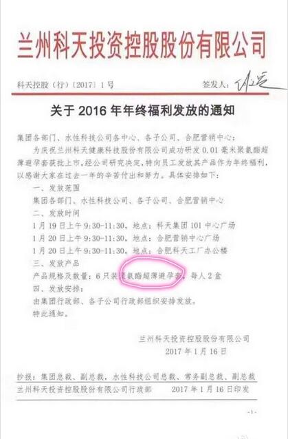 从@猫财经曝光的图片来看,一家名为“兰州科天投资控股股份有限公司”的企业,为庆祝自家研发的0.01mm聚氨酯超薄避孕套获准上市,特地向员工发放了该产品作为年终福利。