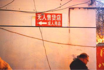 店铺面积约20平米,外包装非常醒目:红底包装纸覆盖了整个门面,交错相间的黑白字毫无避讳地写着“成人用品24小时自助服务,情趣用品、保健用品、两性用品、未成年人不得入内”等字样,简单直接地告诉人们,这里有什么。
