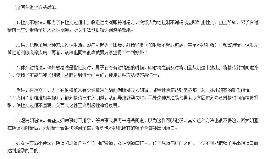 另外,安全期避孕也是比较不妥的,即使是在经期也有怀孕的可能,因此利用安全期避孕并不是可靠的方法。