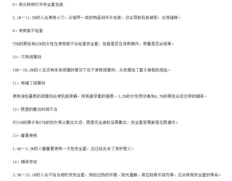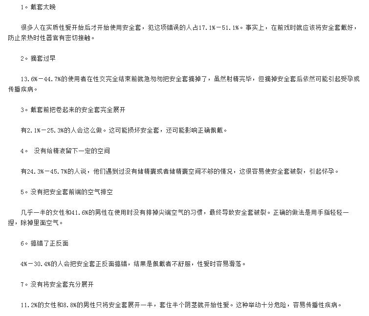 现在最合理有效的避孕工具非安全套莫属,那么问题又来了,居然还有人不会戴安全套!据了解国外的性教育一般在学生孩童时期就开始了,而我们很多“羞涩”一些的大学生甚至分不清安全套的正反面。下面是安全套的错误使用方法,男士们应谨记。
