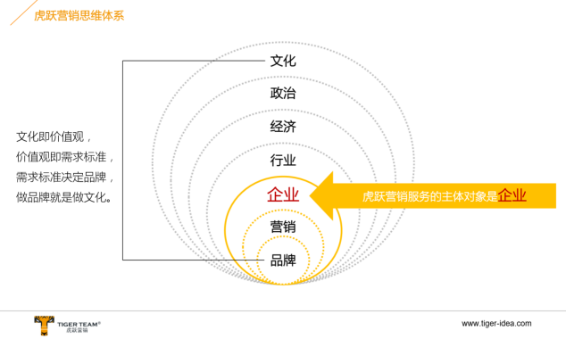 虎跃营销认为:品牌是营销的一部分,营销是企业的一部分,企业是行业的一部分,行业是经济一部分,经济是政治一部分,政治是文化一部分。
