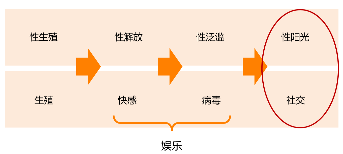 第三阶段:性快感成为性行为的重要目的,而产生了附属品——性病。安全套再一次将快感与病毒隔离开来,使人们可以尽情的追求性快感,进一步推动了性行为属性和需求向第四阶段发展,性开始阳光化,因而性行为发展至今已经变成了社交行为。