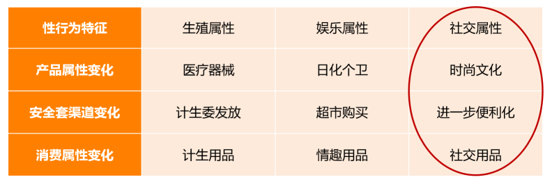 当性文化影响性行为发生特征的变化时,相对应的安全套的产品属性、渠道、产品本质的消费属性随之都发生变化。安全套由计生用品逐渐演化为社交道具,用什么样的安全套代表了一个人的个性、品味,甚至可以体现两个人的关系程度。