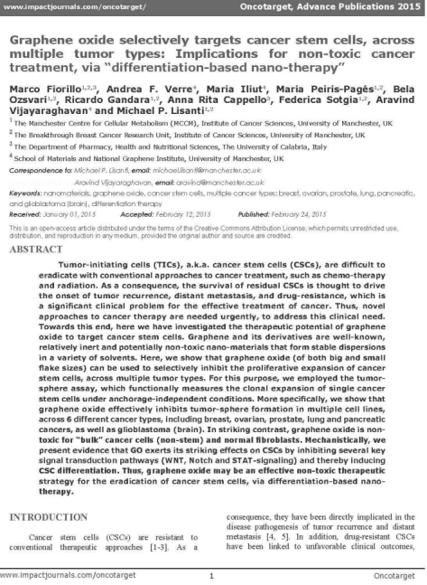 该网站上有这样一篇文章:据Oncotarget杂志报道,一个来自英国曼彻斯特大学,由Michael Lisanti(曼彻斯特肿瘤学研究所的教授)领导的团队,叙述了氧化石墨烯(一种石墨烯的改良版本)是如何全面作用于各种肿瘤的肿瘤干细胞的。这些研究人员表示他们的研究成果为将石墨烯融入现有的治疗方法提供了可能,其不仅能使肿瘤缩小,还能防止复发和转移。
