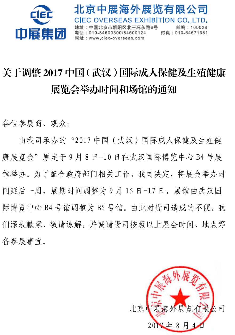 由我司承办的“2017 中国(武汉)国际成人保健及生殖健康展览会”原定于9月8日-10日在武汉国际博览中心 B4 号展馆举办。为了配合政府部门相关工作,我司决定,将展会举办时间延后一周,展期时间调整为 9月15日-17日,展馆由武汉国际博览中心 B4 号馆调整为 B5 号馆。由此对贵司造成的不便,我们深表歉意,敬请谅解,并诚请贵司按照以上展会时间、地点筹备参展事宜。