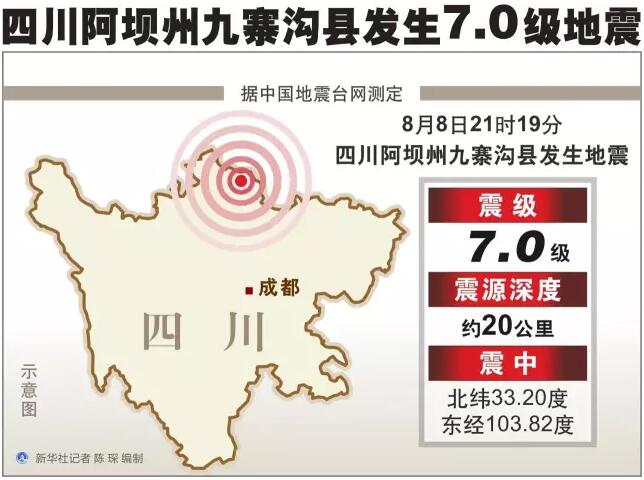8月8日21时19分,四川省阿坝州九寨沟县(北纬33.2度,东经103.82度)发生7.0级地震,震源深度20公里。