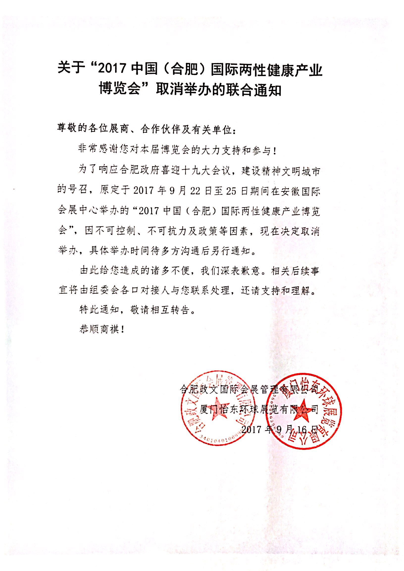 原定于于9月22-25日在安徽国际会展中心举办的中国(合肥)国际两性健康产业博览会(简称“合肥两性健康展”)由于不可控力因素决定取消举办,给广大新老客户带来不便之处,敬请谅解!