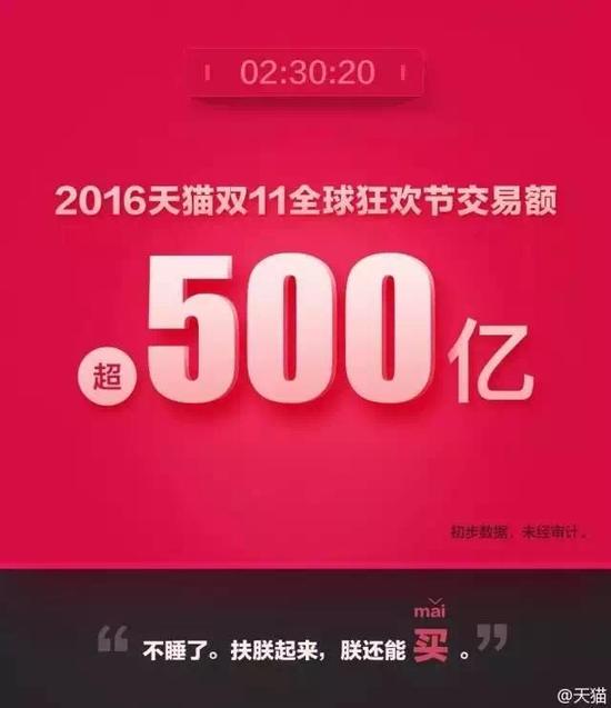 眼见着败家娘们儿让数据瞬间超速,天猫双十一交易额超500亿,就问还有什么能阻止天猫?!天猫文案:不睡了。扶朕起来,朕还能买。