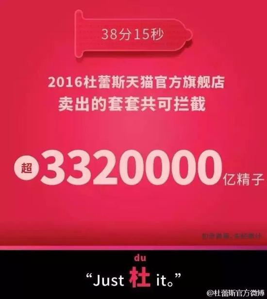 什么叫借力打力,看杜蕾斯就知道了。面对天猫上百亿的数据,杜蕾斯发声:Just 杜 it!文案:没有一个男人会因为啪啪啪而疲惫,特别是坚挺的男人——38分15秒,3320000亿精子。