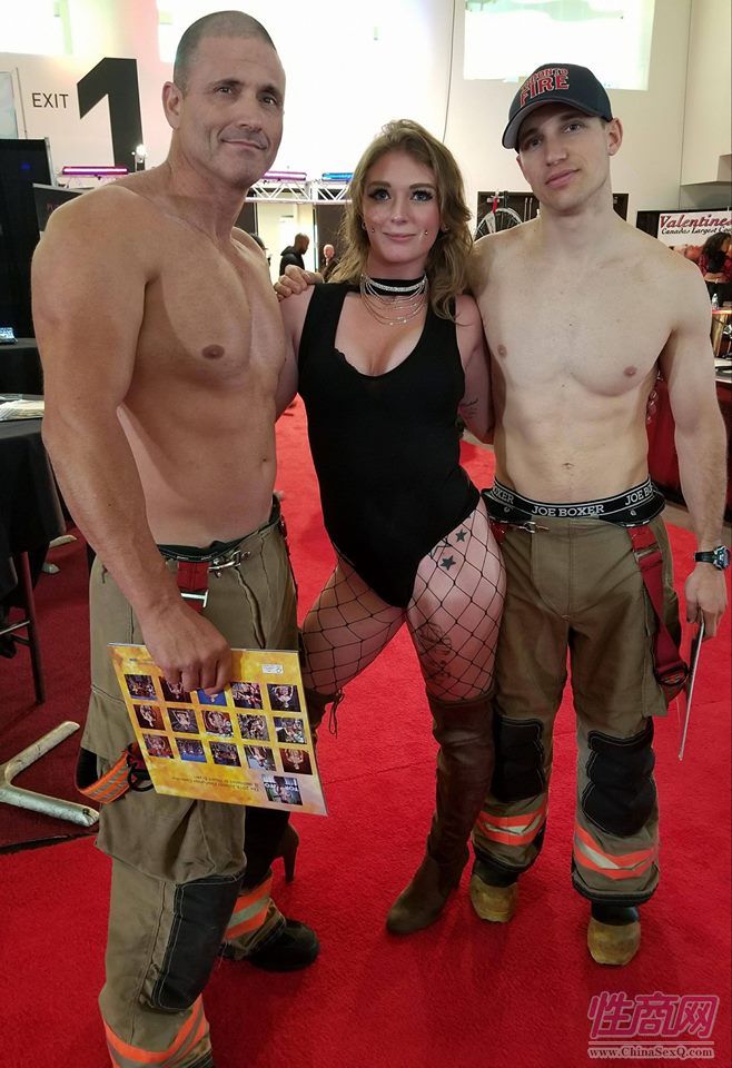 影星Lindsay Elizabeth和与肌肉男消防员合影,购买消防员日历可以支持公益组织抗癌基金会