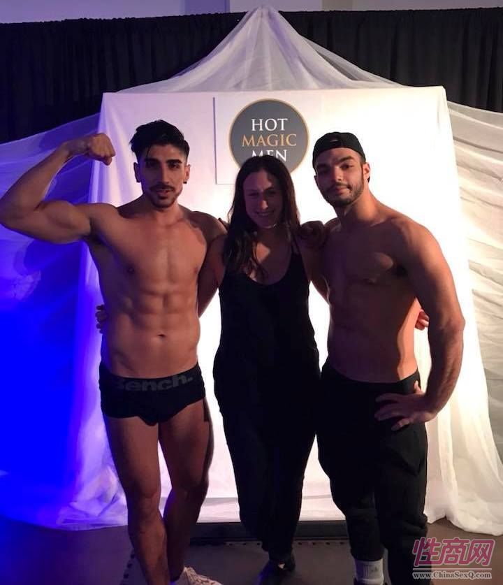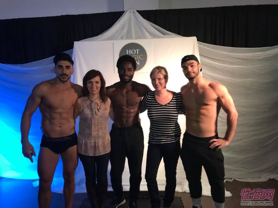 两位中年女观众与肌肉男模特合影