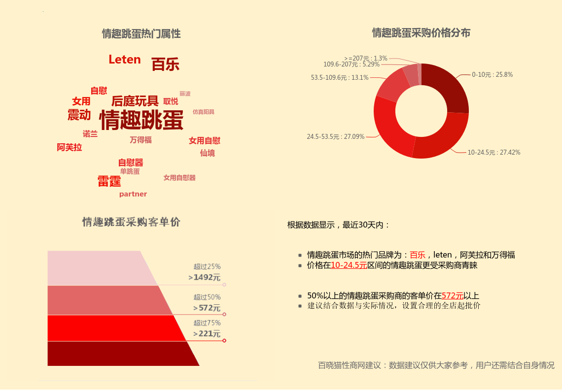《周记》第四期将近30天的情趣跳蛋、震动棒、仿真阳具和后庭用品相关采购数据进行汇总,并从采购价格区间,平均客单价,商品属性和规格等多个维度进行了分析。