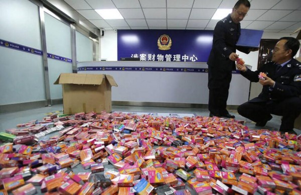 1月3日,山西运城市盐湖区,运城市公安局盐湖分局警察在清点、核对一起假冒商品涉案赃物。至此,山西两个制售假冒“杜蕾斯”、“杰士邦”、“诺丝”等注册商标的安全套窝点被成功捣毁,5名犯罪嫌疑人悉数落网。据悉,此次捣毁活动共起获170万个安全套。