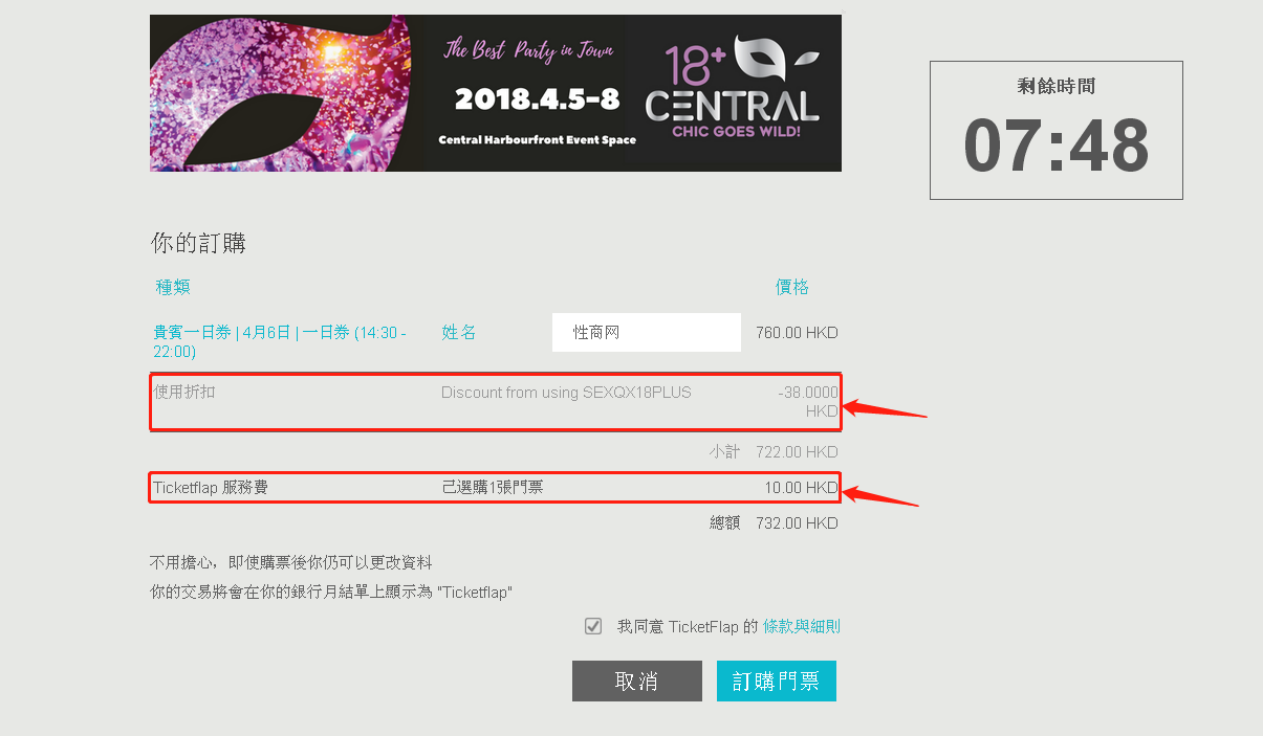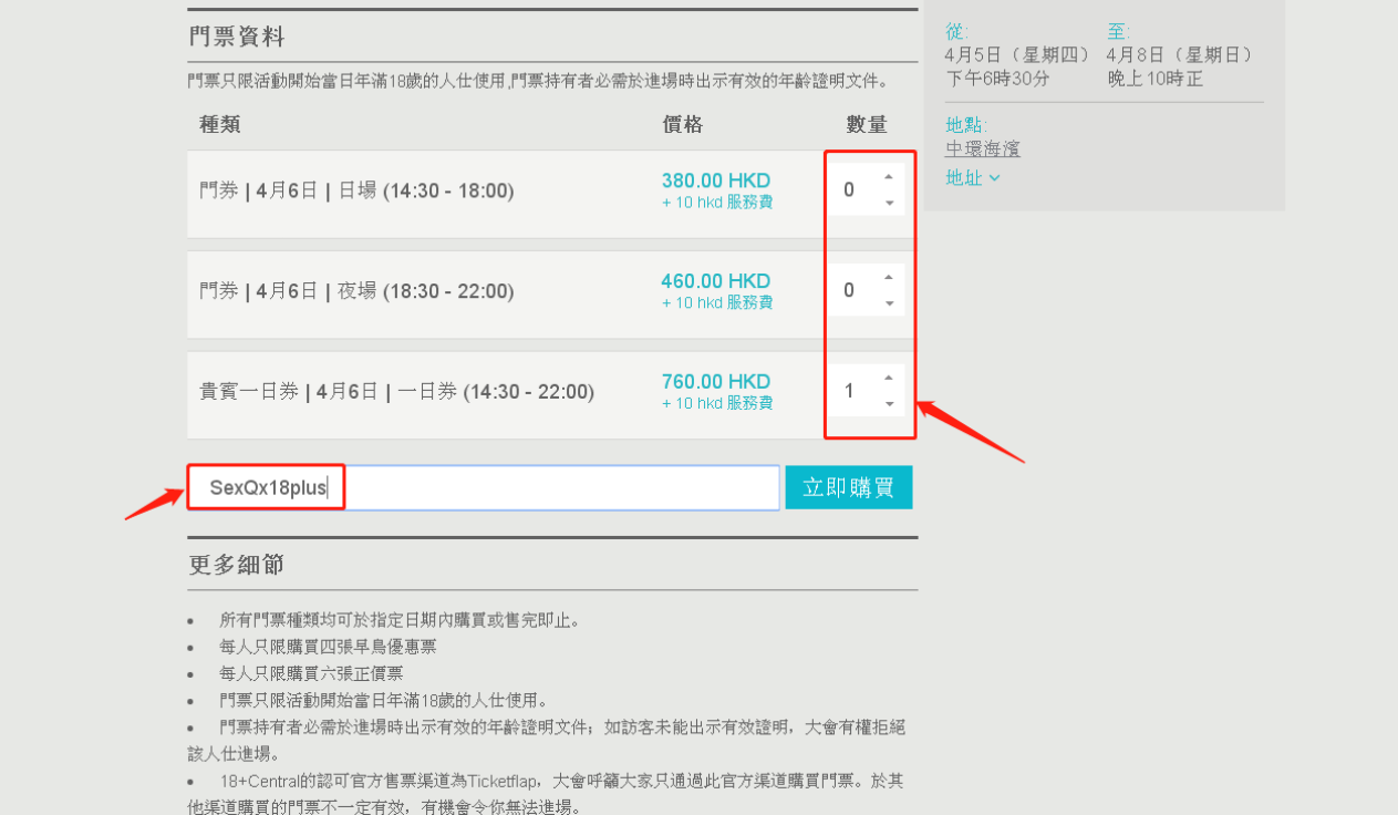 选择你参观展会的具体时间和数量,白天场(14:30-18:00)票价380港元,夜场(18:30-22:00)票价460港元,通票(14:30-22:00)票价760港元。选择后,在下方输入优惠码:SexQx18plus