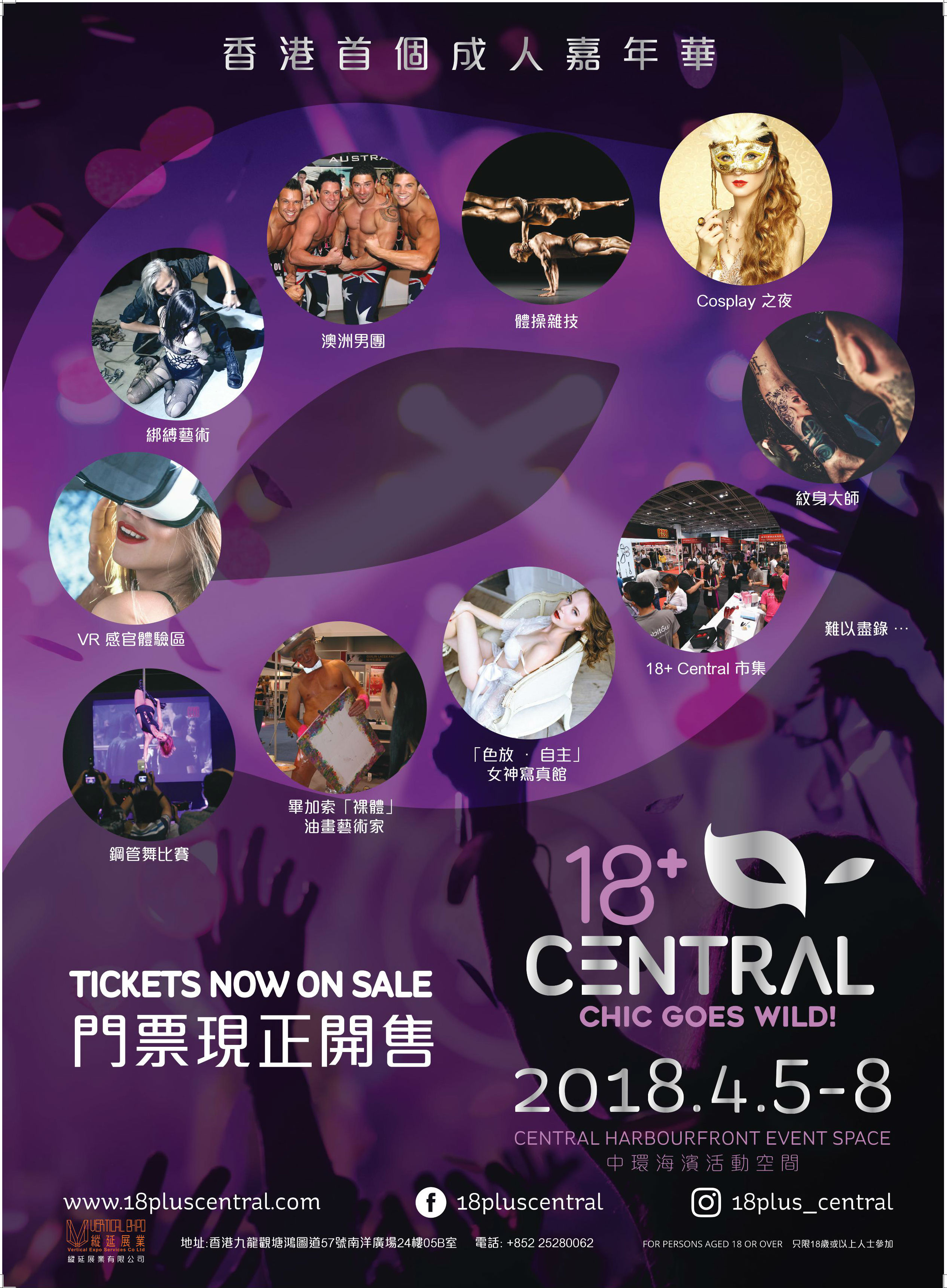 展会特点:18+ Central 将于2018 年4月登陆中环海滨,全城势必掀起自由狂野之风。 作为香港首个成人展,18+ Central 將为成人展重新定义,集舞台表演和感官体验于一体,与男女观众一同打破禁忌,投入到成人华丽派对。
