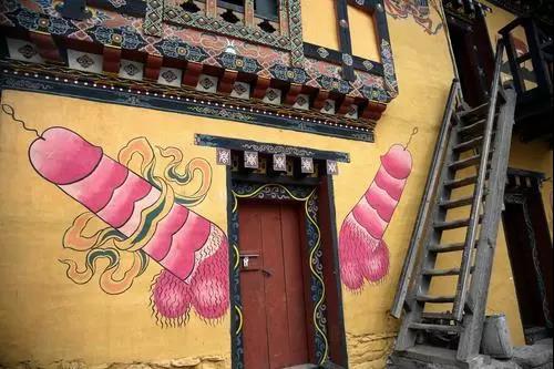 如今的不丹,男性生殖器的象征意义已经和性、繁殖没有什么联系了,只保留了驱凶避邪这一层意思,在房屋内外绘制、悬挂男性生殖器造像,象征着给房主带来好运。