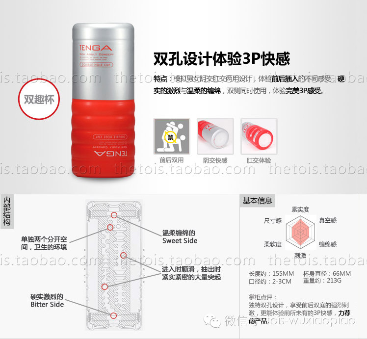 前后两个通道, 2个入口, tenga杯子的两款杯子的综合版本,几次都卖到断货,上部红色的模拟的是私处交,较为松软,.而下面模拟的是后庭交较为紧实.一个杯子让您体验两种感受.