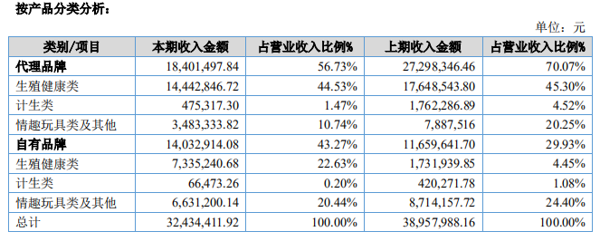 报告中提到,公司的生殖健康类产品销售收入占比有显著提高;其中,代理的生殖健康类品牌收入为1444.28万元,占总营业收入的44.53%;自有的生殖健康类品牌收入为733.52万元,占总营业收入的22.63%。