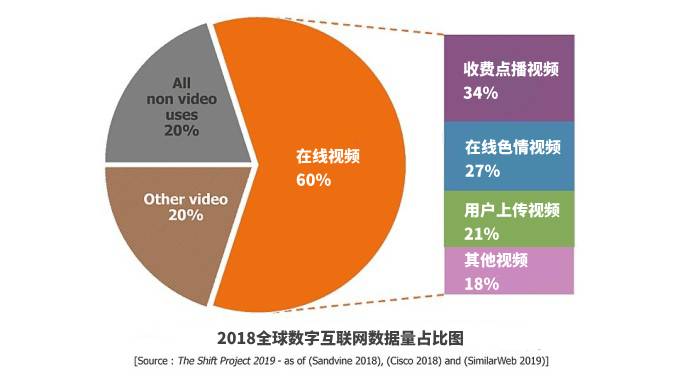 在线视频产生了全球60%的互联网数据量,换算成二氧化碳的排放量为3亿吨,这占数字技术温室气体排放量的20%;也就意味着,在线视频产生的温室气体排放量占了全球排放量的1%。