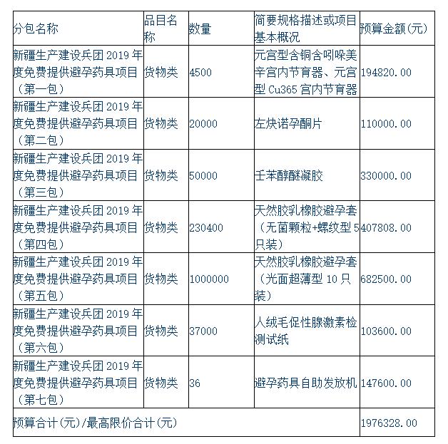2、项目名称:新疆生产建设兵团2019年度免费提供避孕药具项目