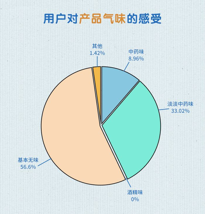 在“用户对产品气味的感受”上,超过一半(56.34%)的用户认为产品基本没有什么特殊气味,也有三成(33.33%)用户认为产品有淡淡的中药味,较少用户(8.92%)认为产品有中药味,还有一些用户反馈产品有“淡淡的香味”。