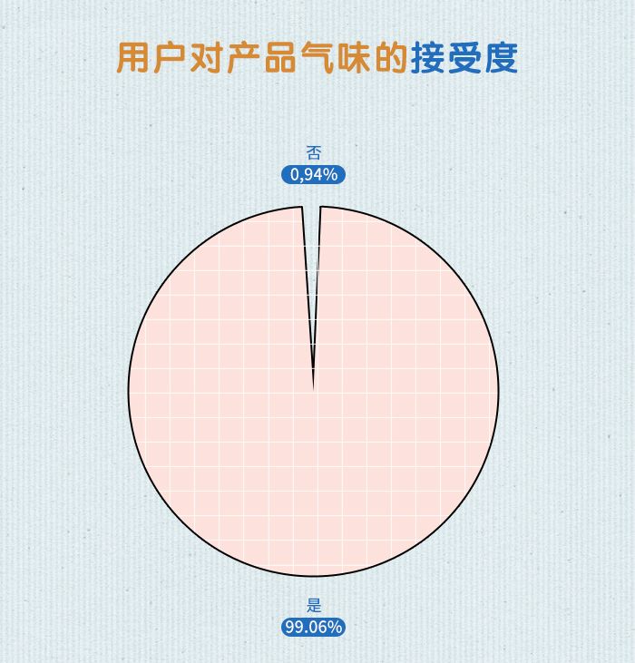 在“用户对产品气味的接受度”上,99.06%的用户表示能接受产品的气味,仅有0.94%的用户表示不能接受产品的气味。