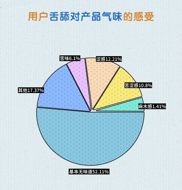 在“用户舌舔对产品味道的感受”上,超过一半(52.11%)用户认为产品没有任何味道,12.21%的用户认为产品有涩感,10.8%的用户认为产品有苦涩感,6.1%的用户反馈产品有苦味,极少数用户(1.41%)还反馈产品有麻木感。